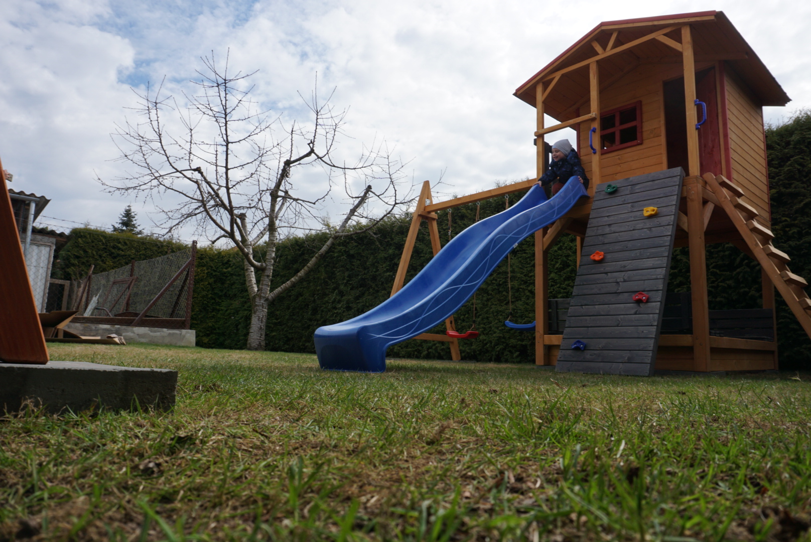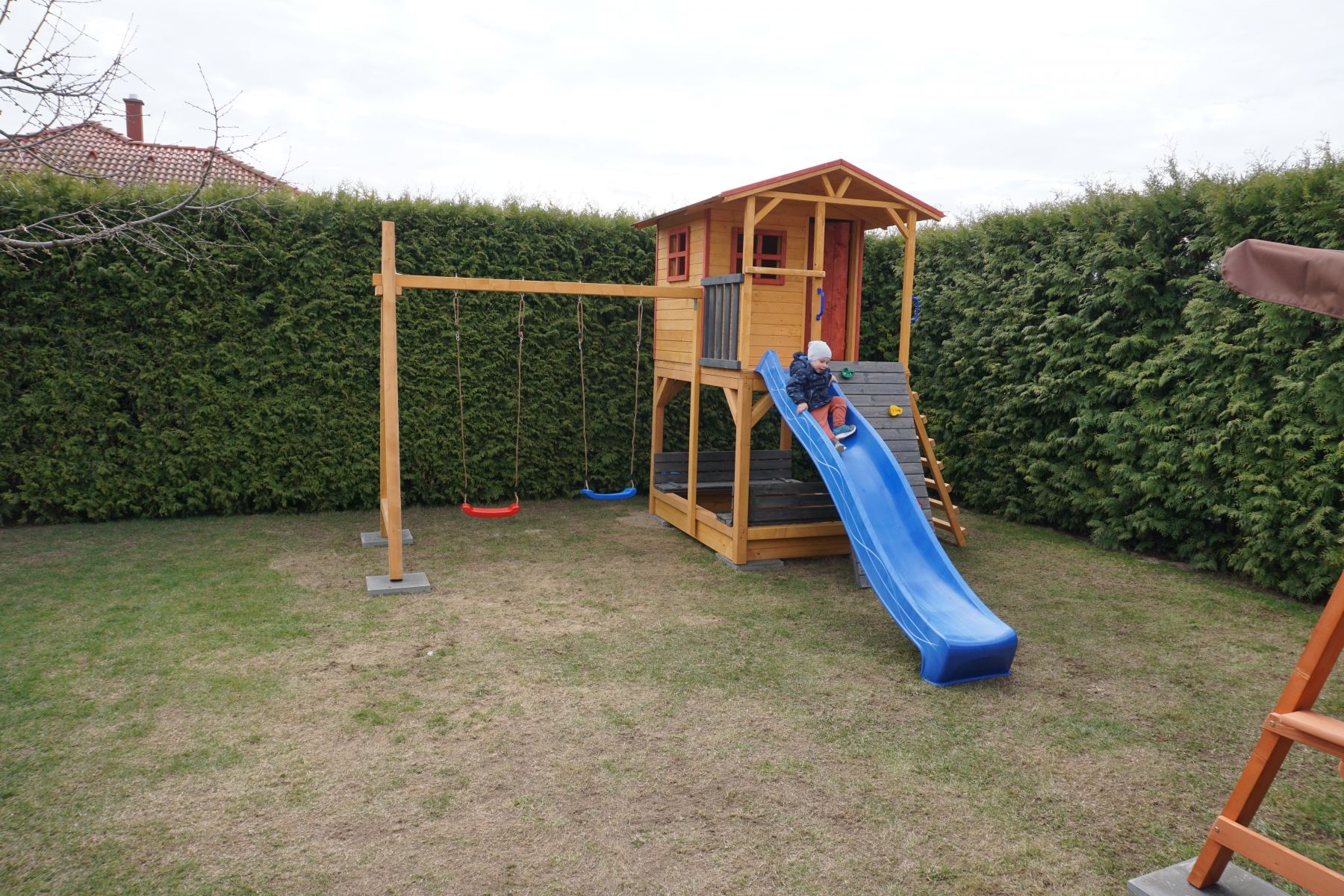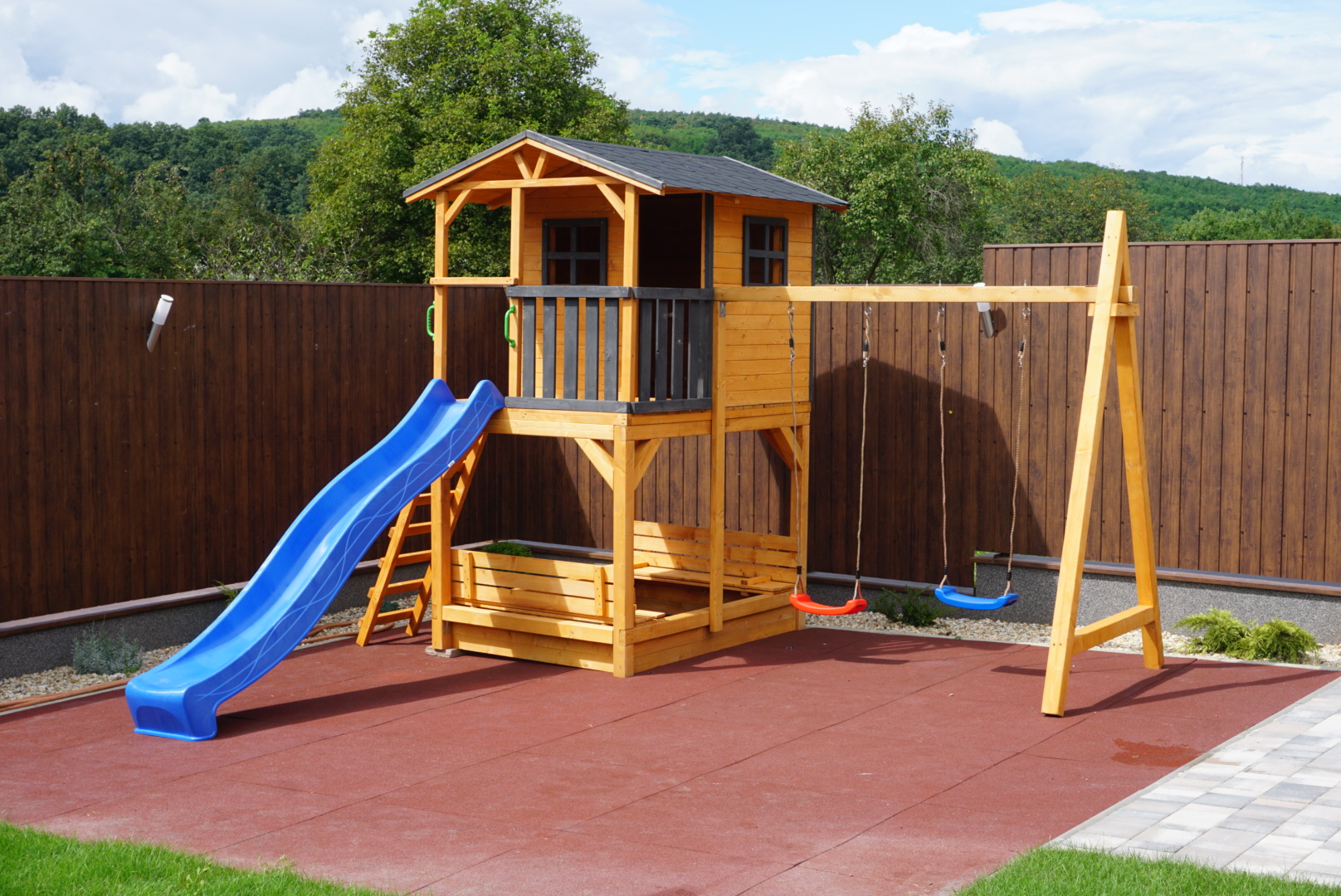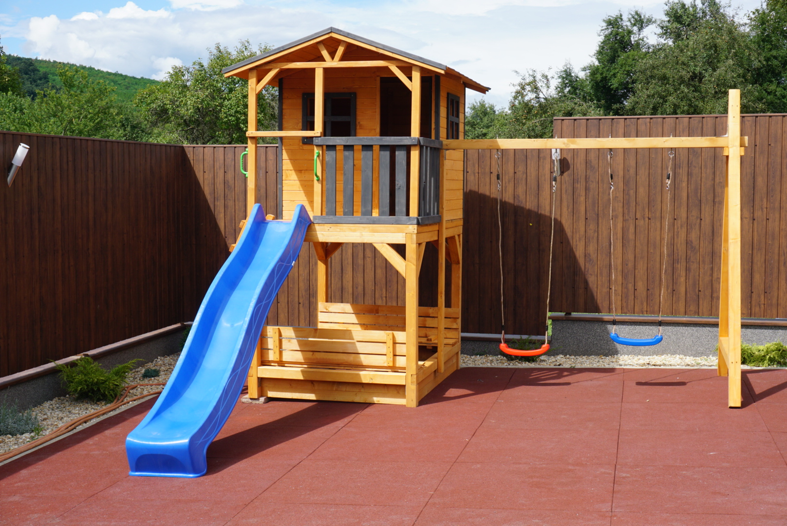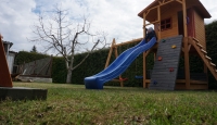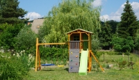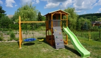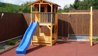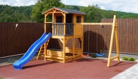 Gyerek játszótér fából házikóval