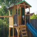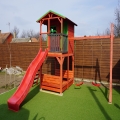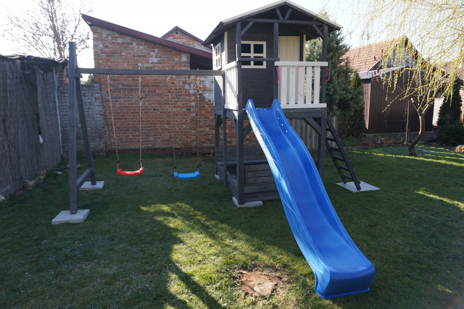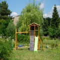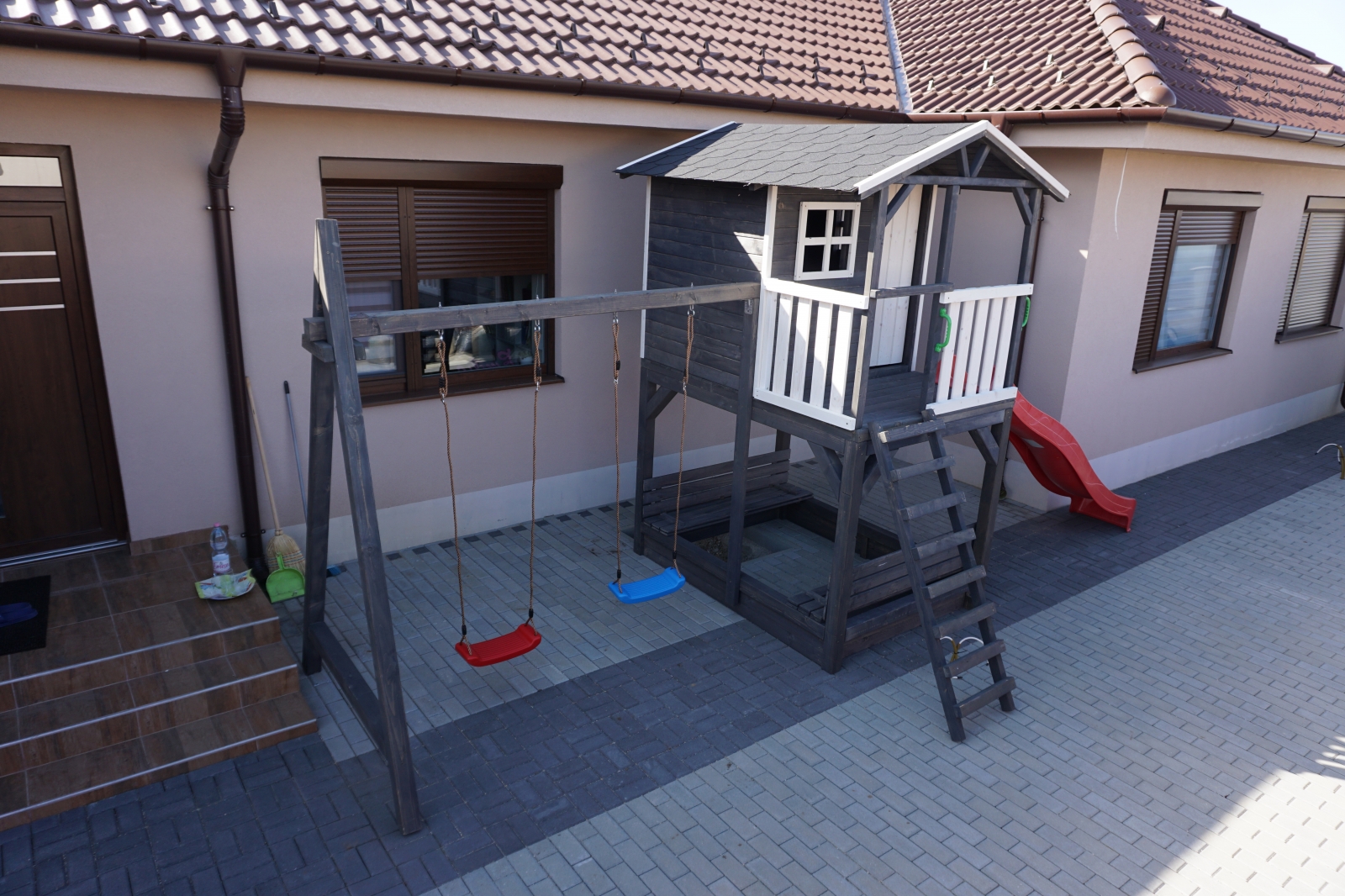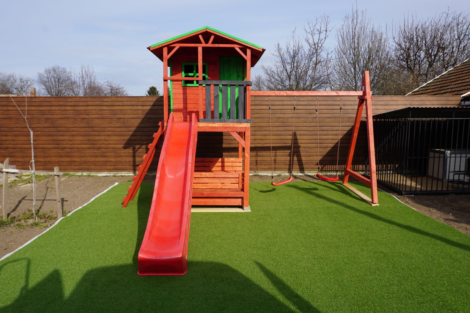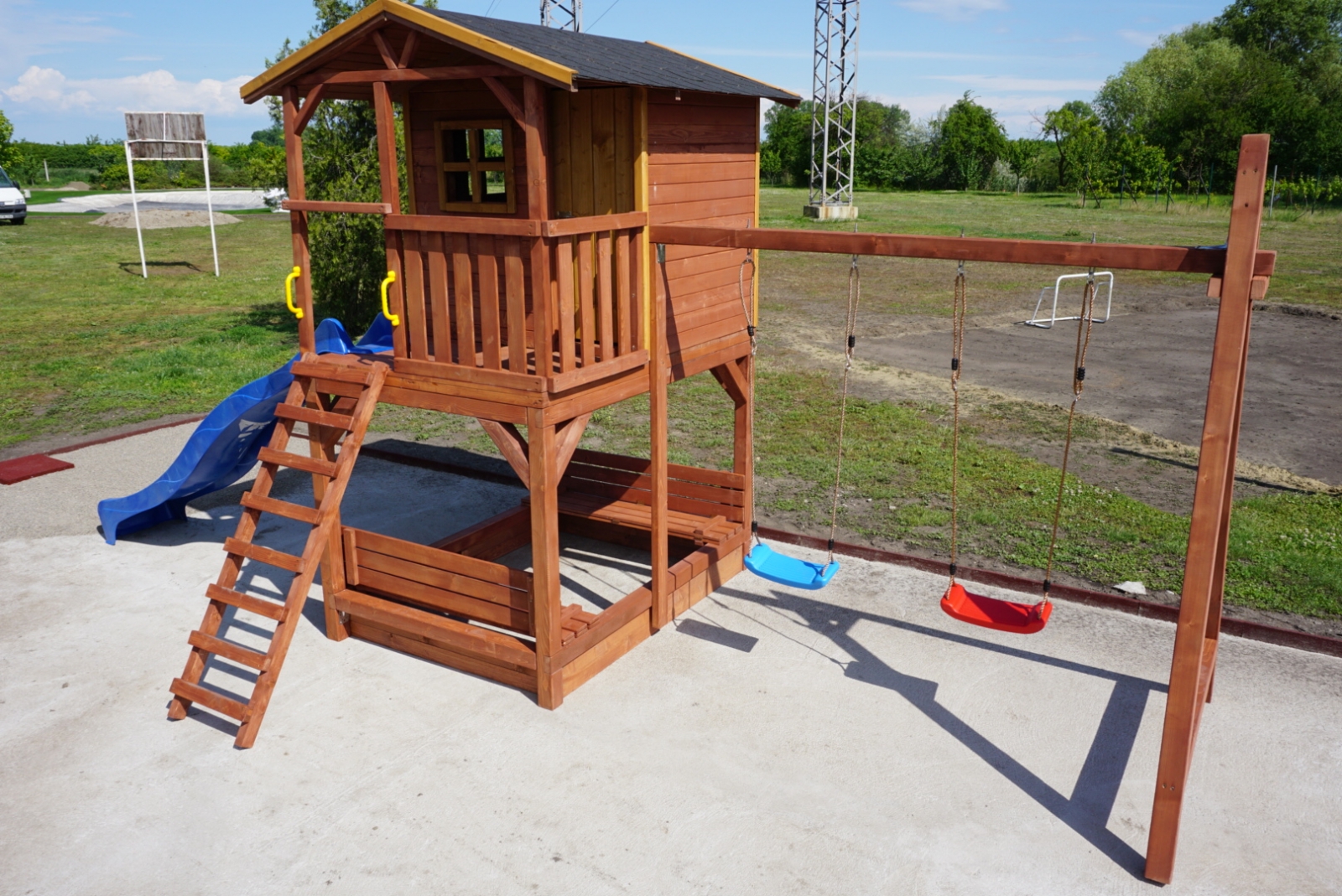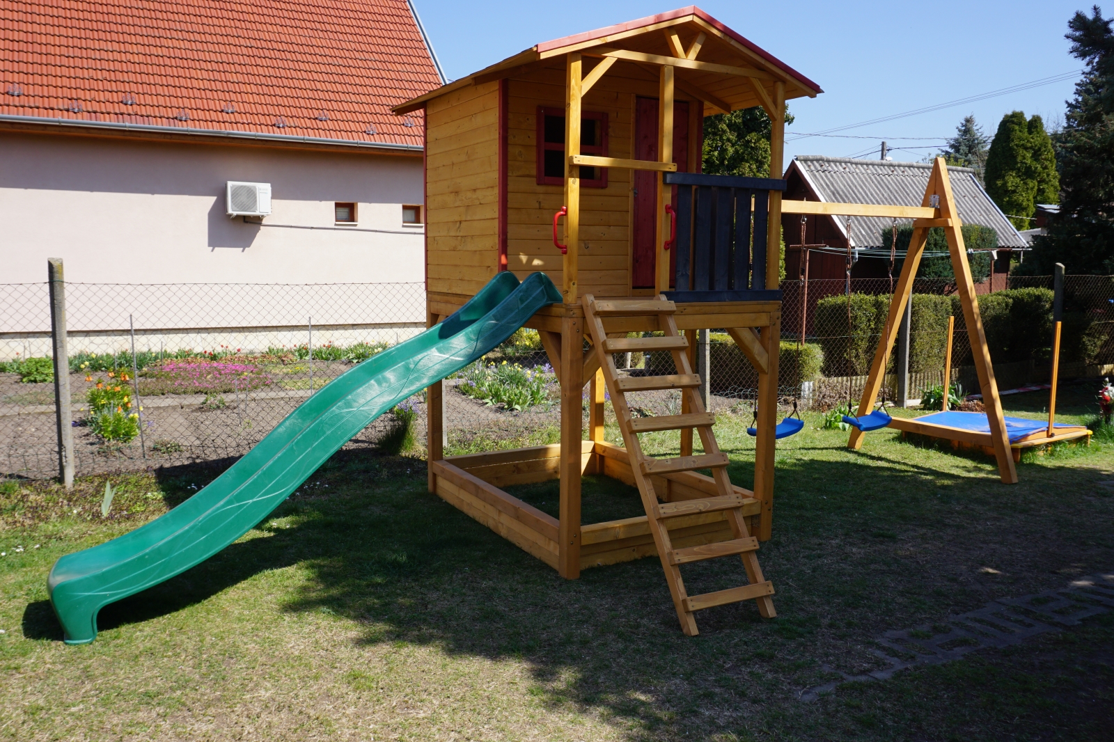 Játszótér házikóval.Tartós masszív szerkezet. Anyaga: időjárás álló nemes jegenyefenyő. Felületkezelés: 2 x vékonylazúr .