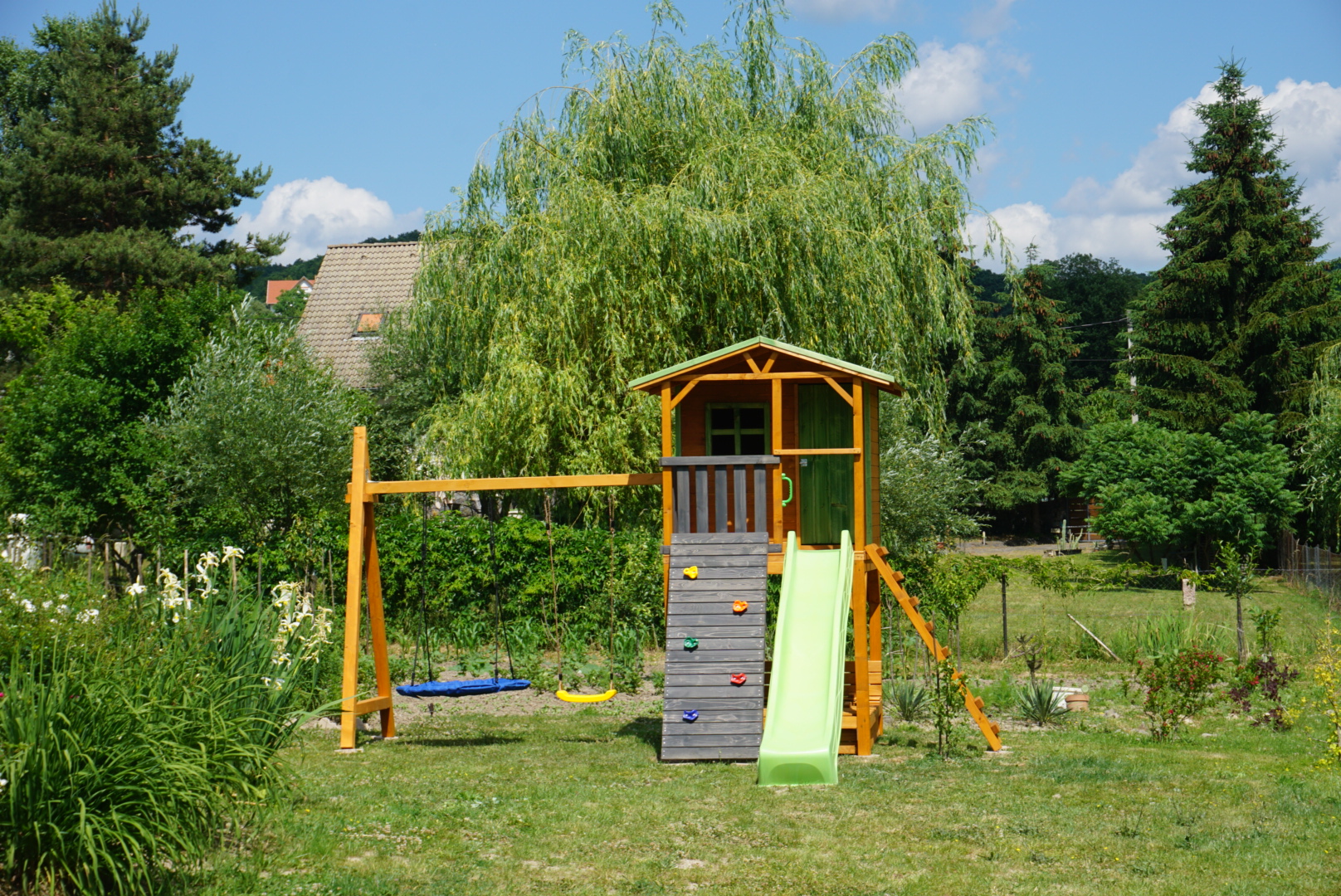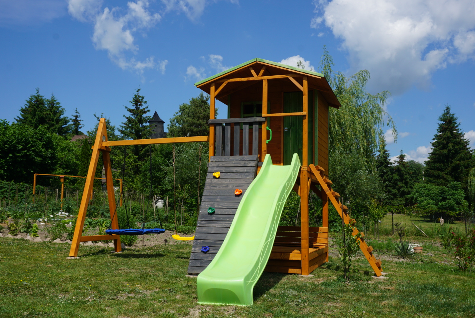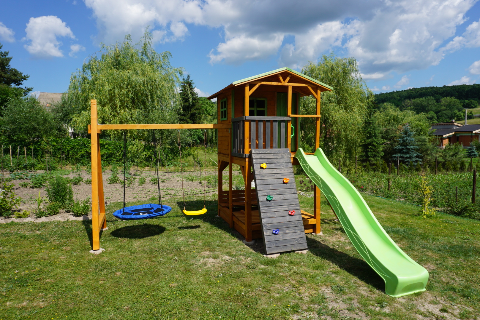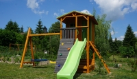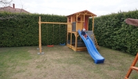 Gyerek játszótér fából házikóval