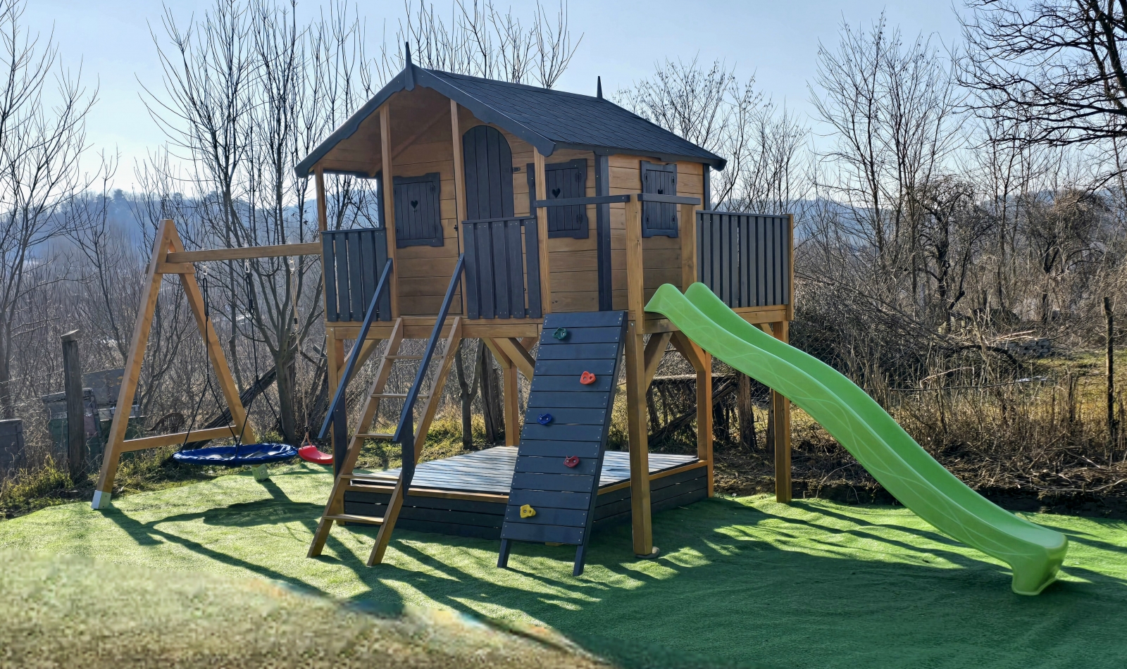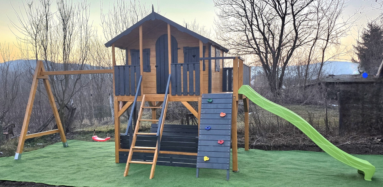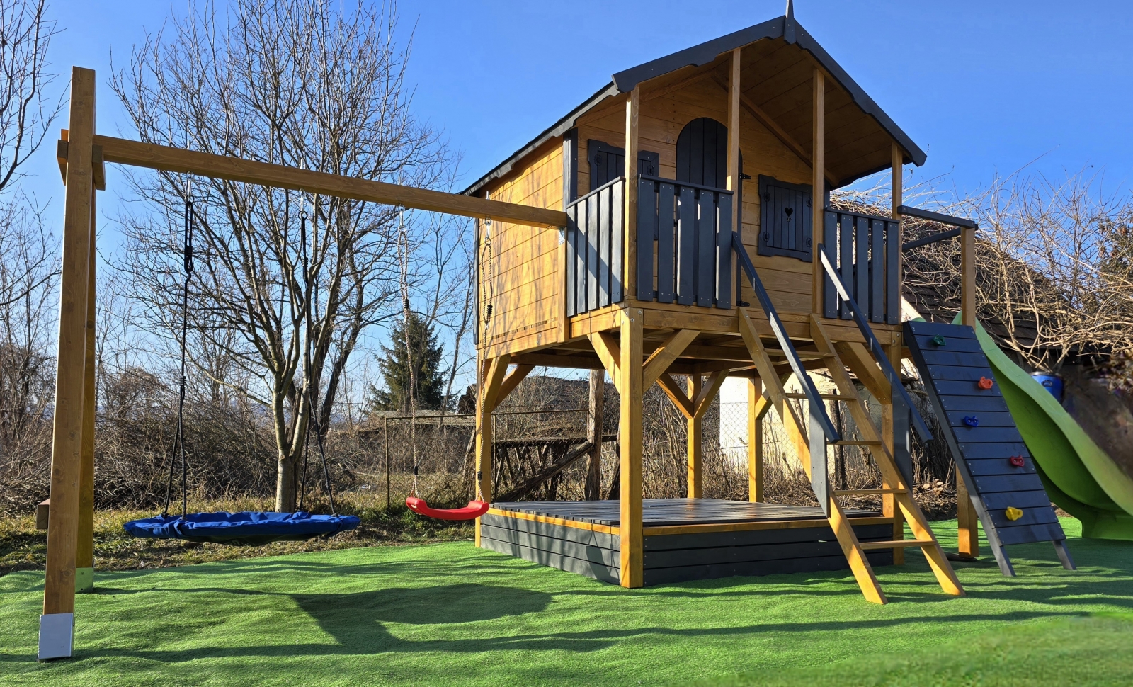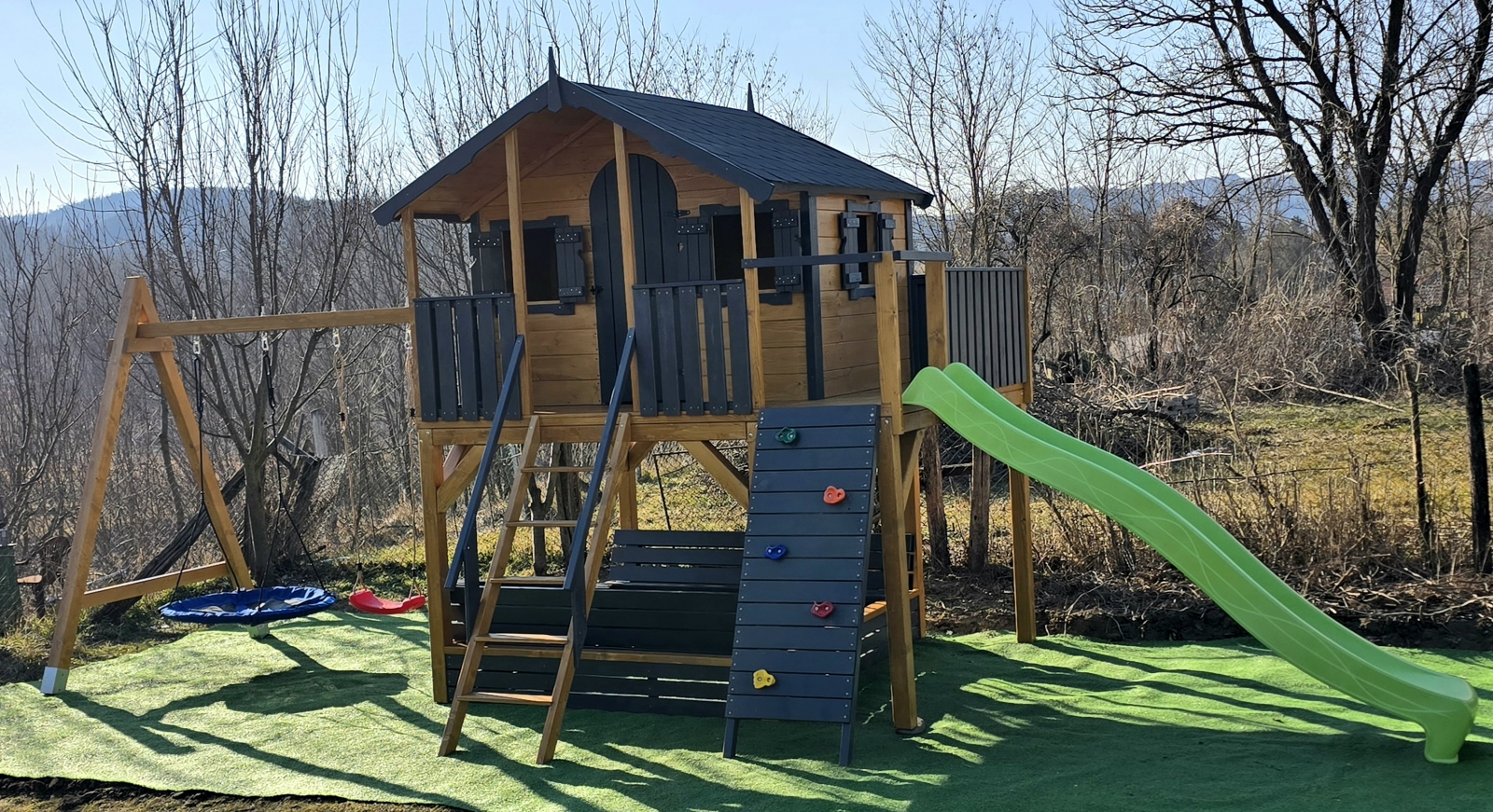 A házikóhoz vezető izgalmas mászófal és csúszda újabb kalandokat tartogat .
