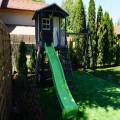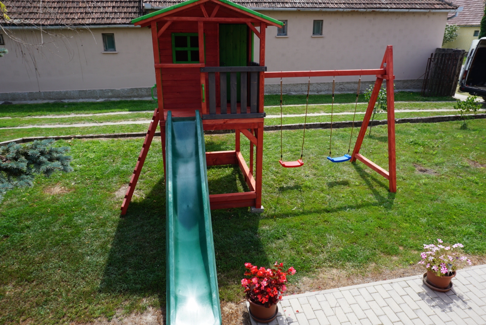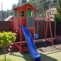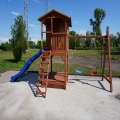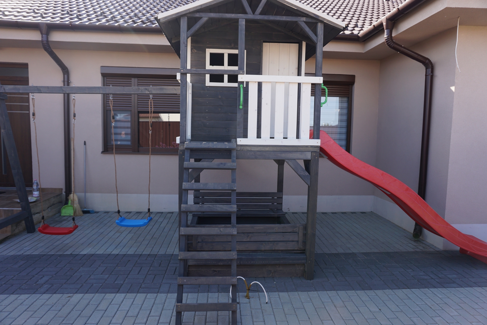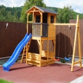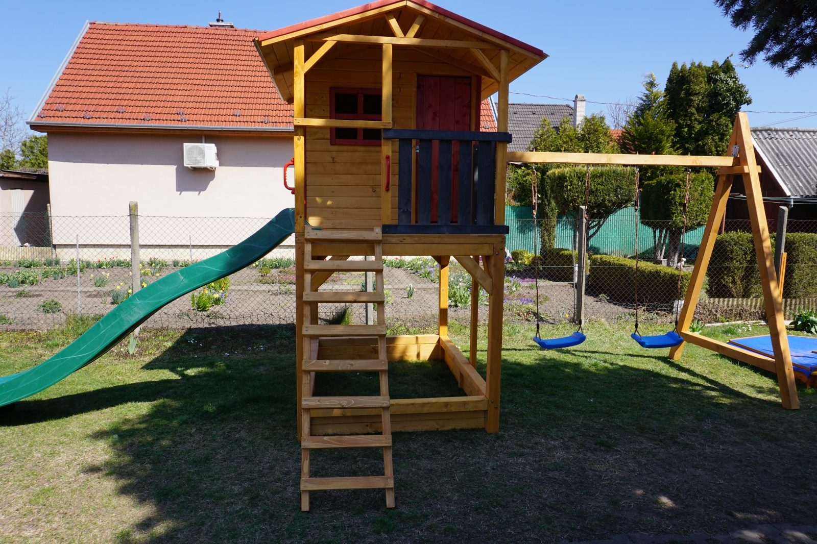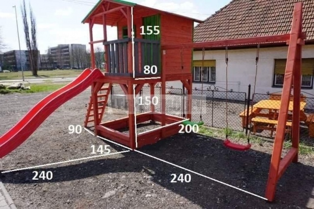 Játszótér házikóval.Tartós masszív szerkezet. Anyaga: időjárás álló nemes jegenyefenyő. Felületkezelés: 2 x vékonylazúr .