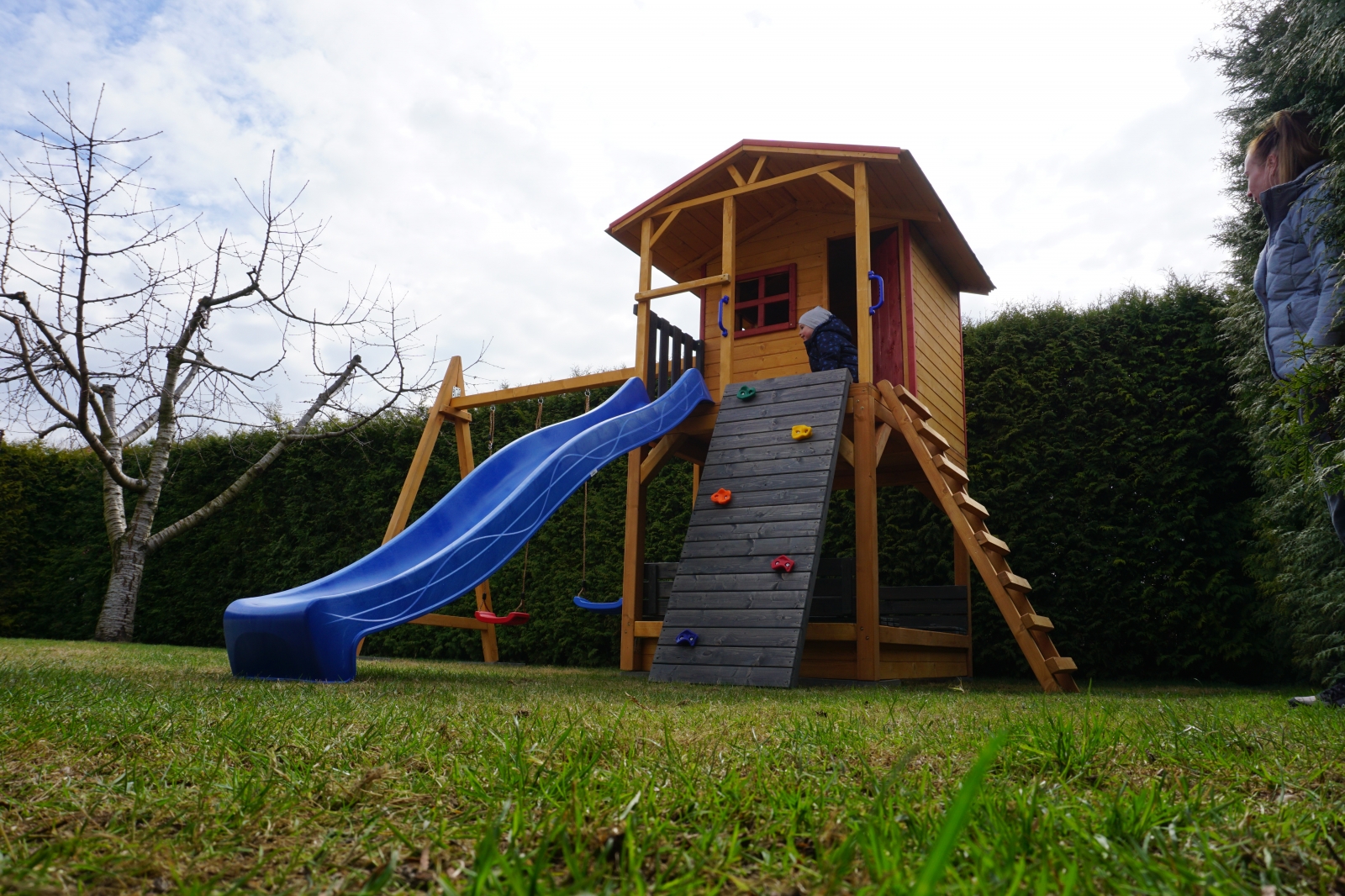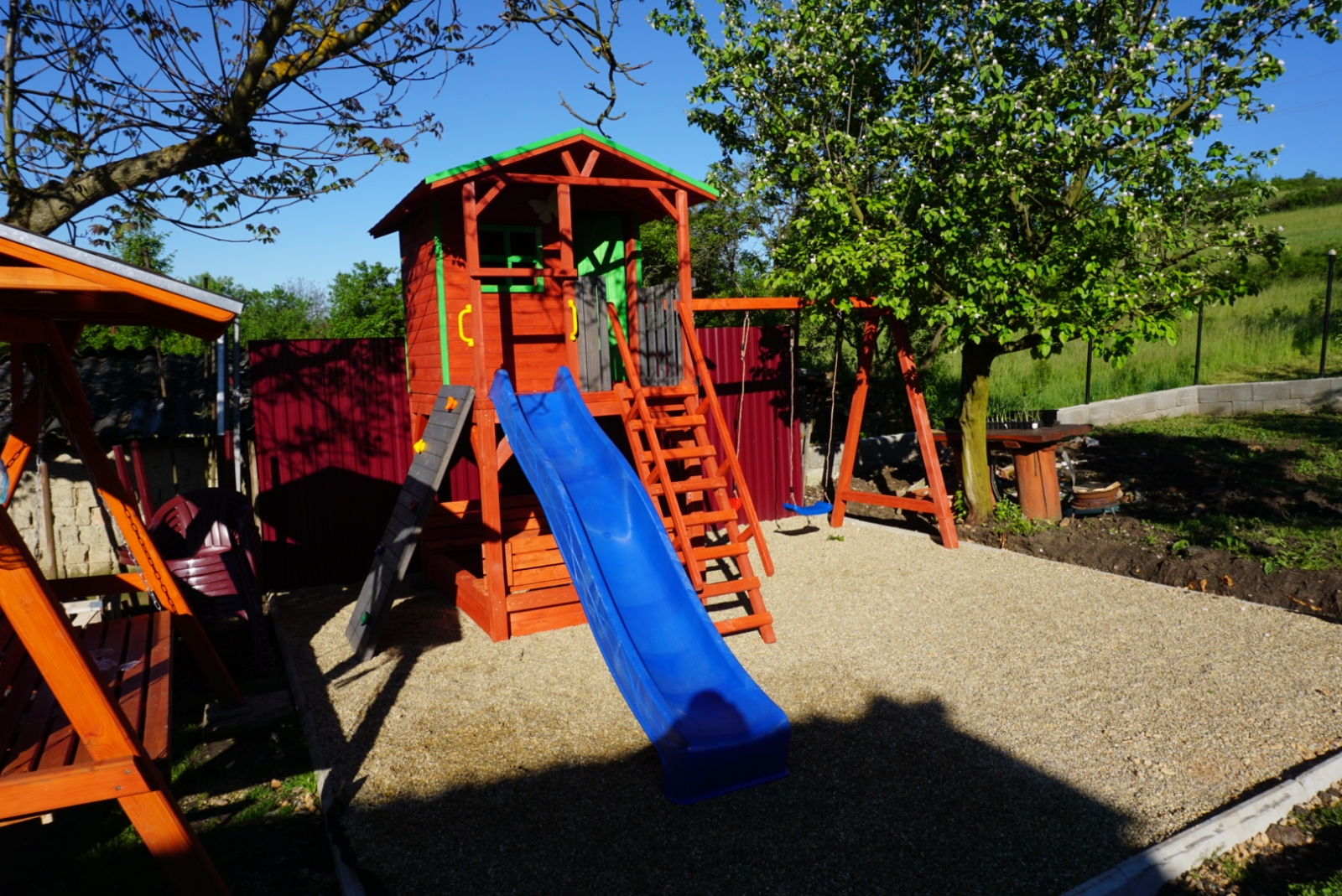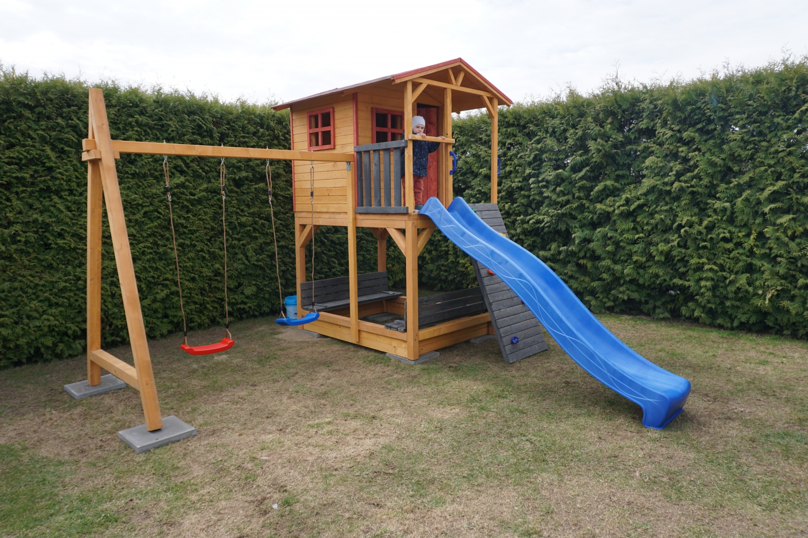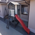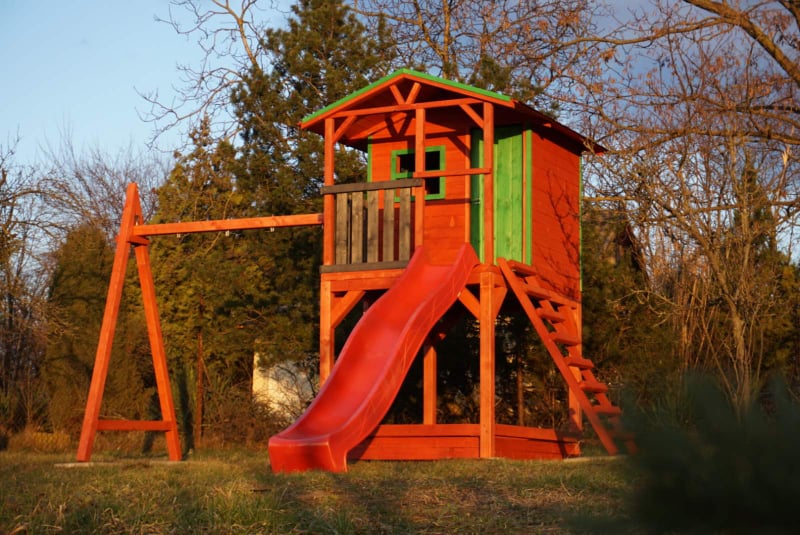 Játszótér házikóval.Tartós masszív szerkezet. Anyaga: időjárás álló nemes jegenyefenyő. Felületkezelés: 2 x vékonylazúr .