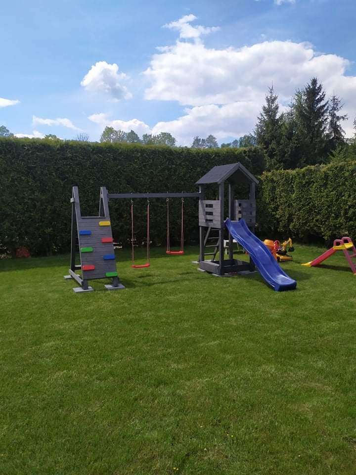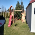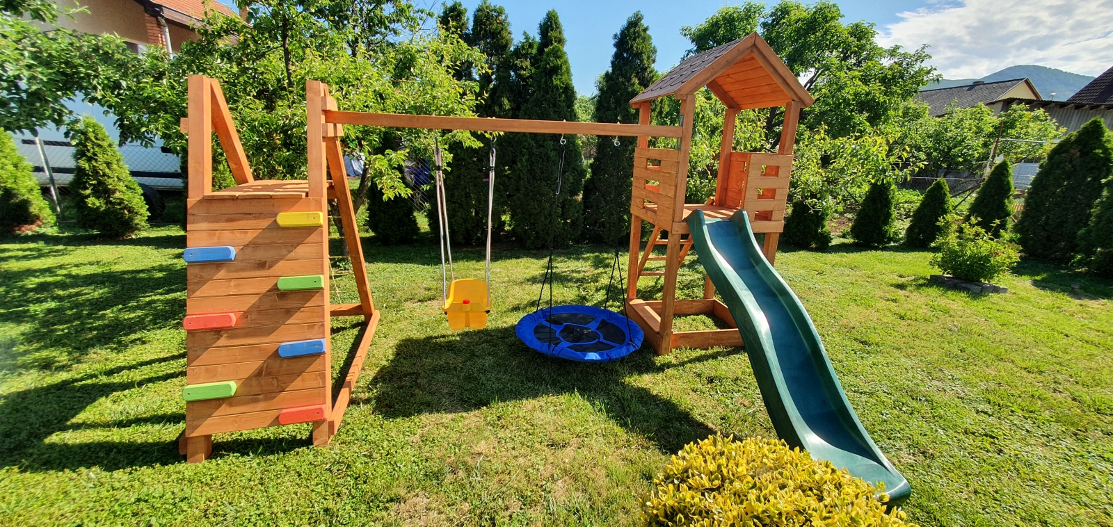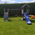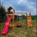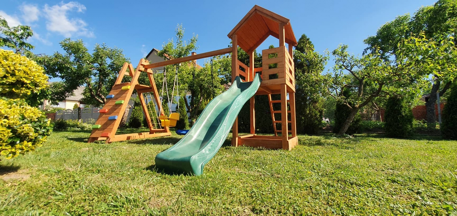 Kerti játszótér Tartós,masszív szerkezet.Anyaga : időjárásálló borovi fenyő.Felületkezelés: 2 x vékonylazúrral, integrálva. Méretek: nalapterület: 4,5 m x 3 m magasság: 260 cm torony: 105 cm x 105 cm toronymagasság: 120 cm Az ár tartalmazza :250 cm csúszda 2 hinta homokozó létra mászófal-mászóháló torony Extraként vásárolható hozzá:fészekhinta + 15 000 ft
