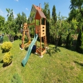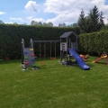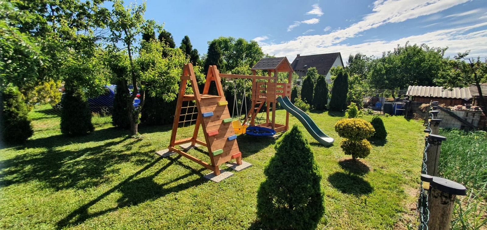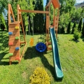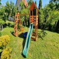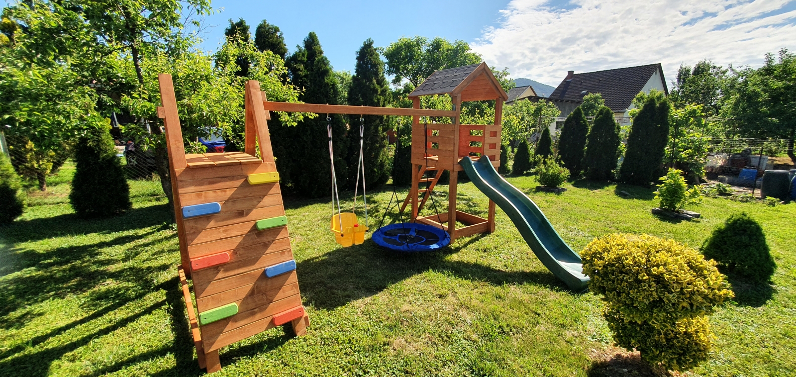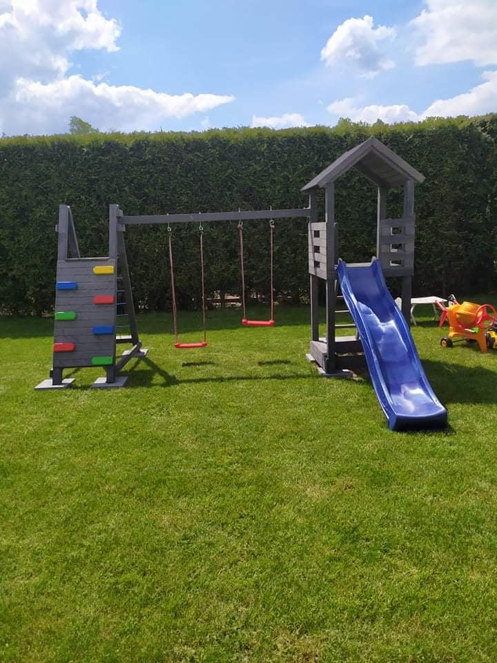 Kerti játszótér Tartós,masszív szerkezet.Anyaga : időjárásálló borovi fenyő.Felületkezelés: 2 x vékonylazúrral, integrálva. Méretek: nalapterület: 4,5 m x 3 m magasság: 260 cm torony: 105 cm x 105 cm toronymagasság: 120 cm Az ár tartalmazza :250 cm csúszda 2 hinta homokozó létra mászófal-mászóháló torony Extraként vásárolható hozzá:fészekhinta + 15 000 ft